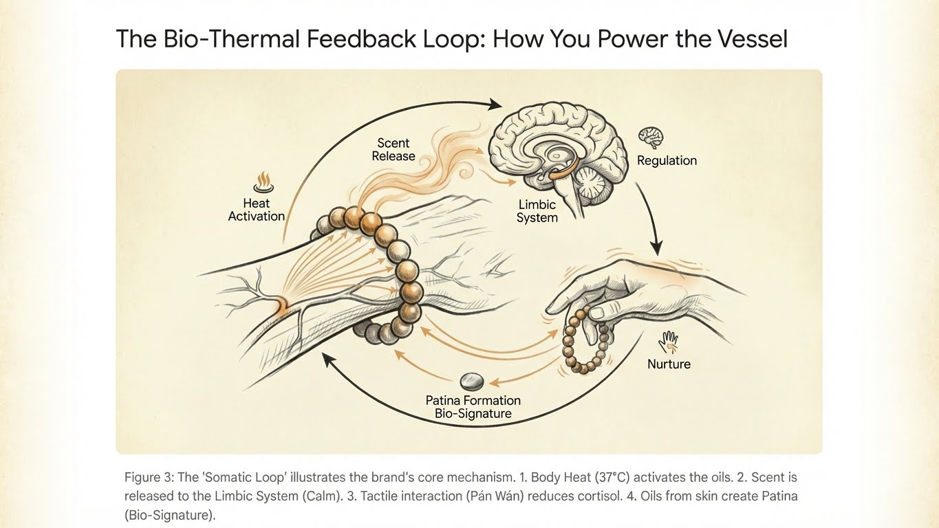 Unlike the "masking" mechanism of modern perfume, the HYLEA Resonant Vessel initiates a Bio-Thermal Loop. Instead of covering up your stress, it creates a cycle of regulation: from the outside in, then from the inside out. This shifts your entire energy field from "High-Functioning Anxiety" to "Embodied Stillness."We don't just seek elegance; we seek the "Window of Tolerance." Through the somatic ritual of Tactile Meditation (Pán Wán), you transform fidgeting into grounding friction. Your body heat (Qi) activates the vessel, releasing shadow-dried botanicals that enter the nasal cavity to directly reset the Limbic System—your brain's emotional command center.Why does this work? Because the "rubbing" provides Tactile Anchoring for a racing mind. Over time, this friction creates a Living Patina (Bāo Jiāng)—visual proof that your stress hasn't broken you, but has been transformed into resilience. It is a complete sensory loop that signals safety to your nervous system through touch, smell, and sight.